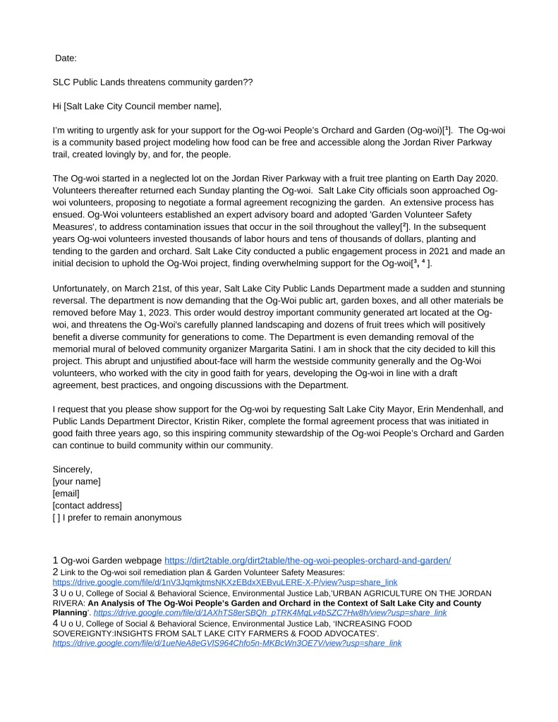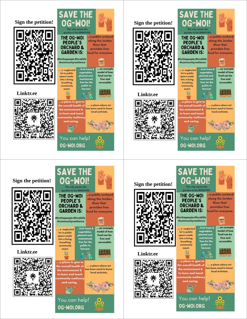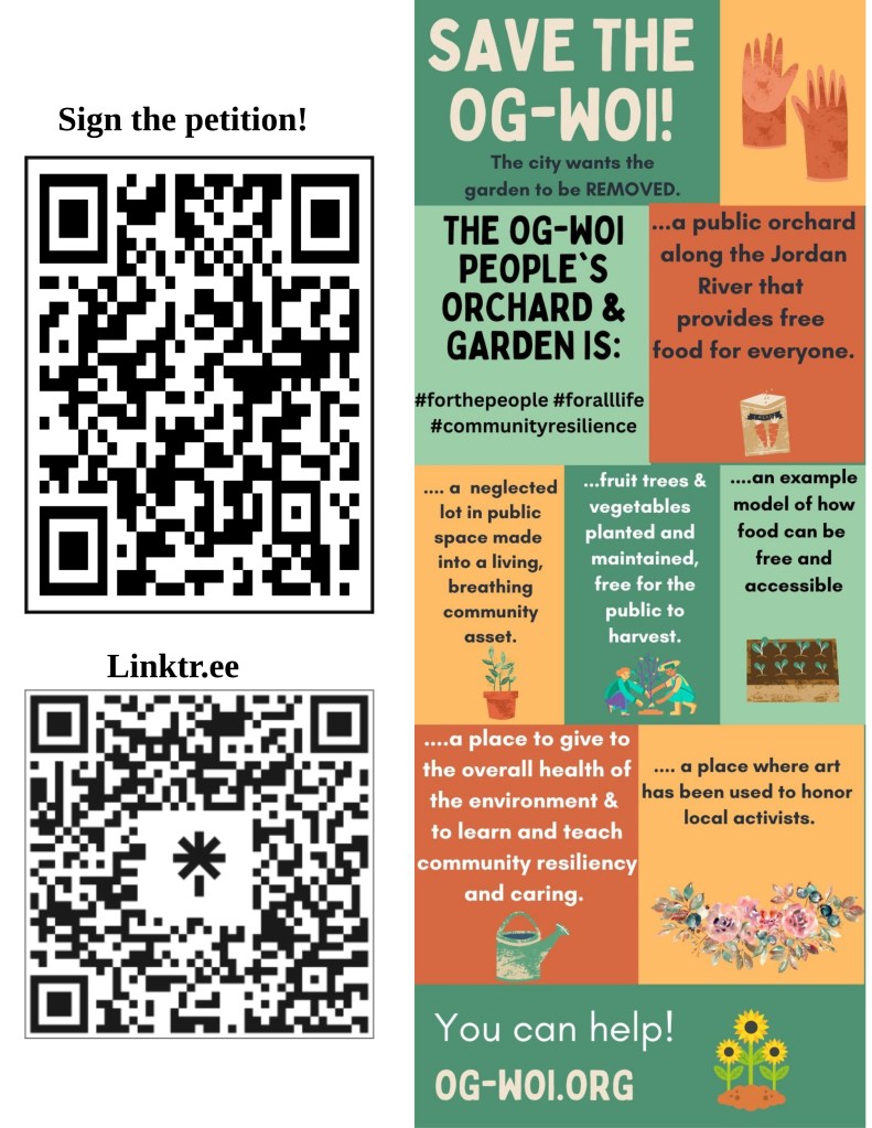 UPDATE, MAY 8, 2023: Salt Lake City Department of Public Lands ordered the garden to be REMOVED via a letter on March 21, 2023. The items below included actions taken to lift the eviction. During the next month, the Og-woi Collective (the Collective) was able to gather the support of several hundred people and create an alliance with Wasatch Community Gardens (WCG). The City is requiring the Collective to work with WCG through the Capital Improvement Program (CIP) Process to formalize the garden to meet the city standards for community gardens. WCG has made it publicly known that it has no desire to take over the Og-woi or change its model of community gardening. The agreement entered into is a temporary one to help the Collective get through the CIP process. The order to evict was lifted on April 21, 2023 and a community engagement process is currently underway. The Collective wishes to thank everyone for their continuing support through this process as we continue to build the Og-woi into a community garden for the people, by the people.